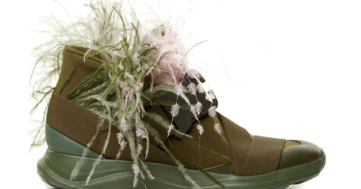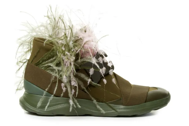 Кристофер Кейн – мастер всяческих затейливых аксессуаров. То придумает сумку с пластмассовым фастексом вместо застежки и моментально сделает ее своей signature bag (теперь такие сумки бренд выпускает в каждом сезоне), то сделает босоножки с футуристичным каблуком в виде кляксы. Очередная «бомба» в исполнении дизайнера – кроссовки, щедро украшенные разноцветными перьями страуса (в новой коллекции Christopher Kane вообще очень много перьев). Откровенно говоря, обувь – не самая сильная сторона бренда: Кейн уделяет этому направлению не так много внимания, что зачастую не в лучшую сторону сказывается на удобстве колодки. Но кроссовки хороши тем, что с ними сложно прогадать – конструкция понятна, используемый нейлон вполне подходит для такого рода обуви. Ну, а если тратить 500 с лишним фунтов на такой экстравагантный аксессуар жалко, на помощь всегда придут тюбик клея и пучок перьев.