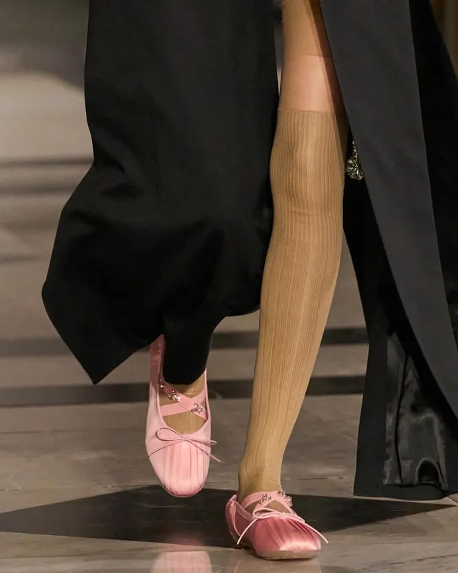 Балетки, как неотъемлемая часть обувной капсулы, уже прочно обосновались в гардеробах модниц. Начиная с коллекции Miu Miu осень-зима 2024, эта пара продолжает покорять подиумы Недель мод. Если в прошлом сезоне самой модной ее вариацией стали кожаные лаконичные модели с квадратным мысом и стильной перемычкой в духе Мэри Джейн, то в этом году их заменила текстильная обувь с аккуратными бантиками на мысе. Да-да, теперь балетки должны выглядеть так, словно вы вышли из класса по хореографии и забыли переодеться. Именно такие пуантовидные модели появились на шоу Gucci Cruise 2025, а также в весенне-летних коллекциях Simone Rocha и Ferragamo. И если последними лучше всего насладиться издалека из-за неудобного высокого каблука и ленточек, которые могут «резать» рост, то первые — то, что доктор прописал в жаркую погоду.