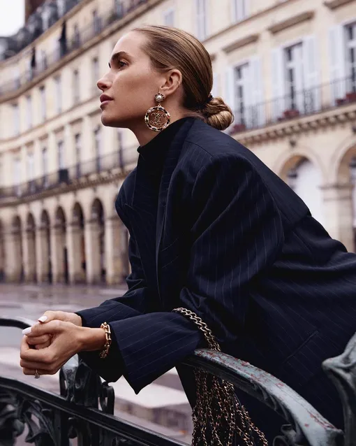 Оттенок, который безошибочно считывается как «дорогой» — темно-синий. Особенно в трикотаже, верхней одежде и брючных костюмах. Поэтому советуем сменить привычные черные жакет и брюки на темно-синие. Мелкая вертикальная полоска будет только плюсом: она и добавит строгости, и вытянет силуэт, сделав вас визуально выше и стройнее.
