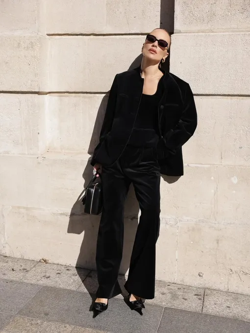 Например, к костюму. Это всегда выгодная инвестиция. Каждую из его составляющих вы сможете носить как вместе, так и по отдельности, адаптируя под самые разные сценарии. Бархатный жакет мгновенно добавляет винтажного шика базовым джинсам, превращая обычный дневной образ в вечерний. А брюки прекрасно смотрятся с блузами и акцентными топами. Юбка или рубашка — прекрасный выбор для тех, кто ищет универсальные вещи, способные жить в разных ситуациях. И не забывайте про детали. Если хочется поддержать тему бархата, но образ уже насыщен другими фактурами, сделайте ставку на аксессуары, сумку или обувь.