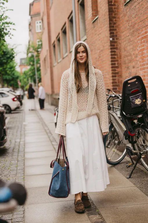 Конец лета не радует погодой. С каждым днем становится все прохладнее: ветер, дождь и резкие перепады температуры. Но впереди еще целая неделя августа, и это отличный (последний) шанс выгулять свои любимые летние вещи. Как не замерзнуть и при этом выглядеть стильно? На помощь приходит универсальный элемент гардероба — свитер. Его можно носить десятками разных способов: на плечах, на талии, как шарф или полноценный верхний слой. За вдохновением мы обратились к уличным хроникам Недели моды в Копенгагене. Там фэшн-инфлюенсеры наглядно показали, что свитер летом — не только практичное решение, но и модный акцент. Мы выбрали шесть идей, которые легко повторить.