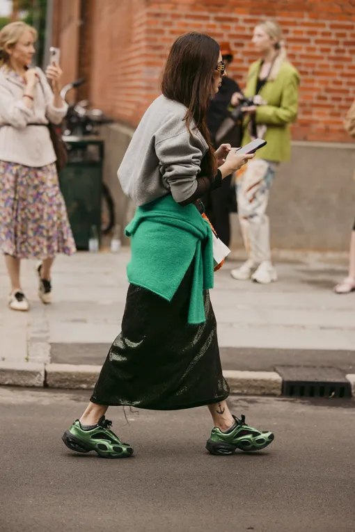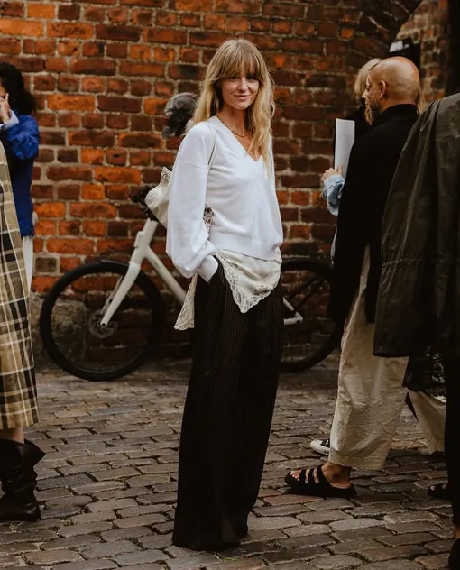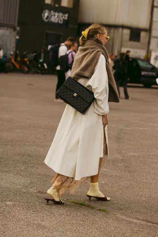 Необычный способ использовать свитер — обыграть его как аксессуар. Возьмите платье-комбинацию, добавьте сверху тренч и модные мюли в сочетании с носками, а вместо привычного шарфа накиньте тонкий свитер. Такой прием идеально отражает дух стритстайла Копенгагена: умение превратить функциональную вещь в декоративный элемент. Это особенно актуально для вечерних выходов, когда вечером еще тепло, но ближе к ночи становится прохладно.