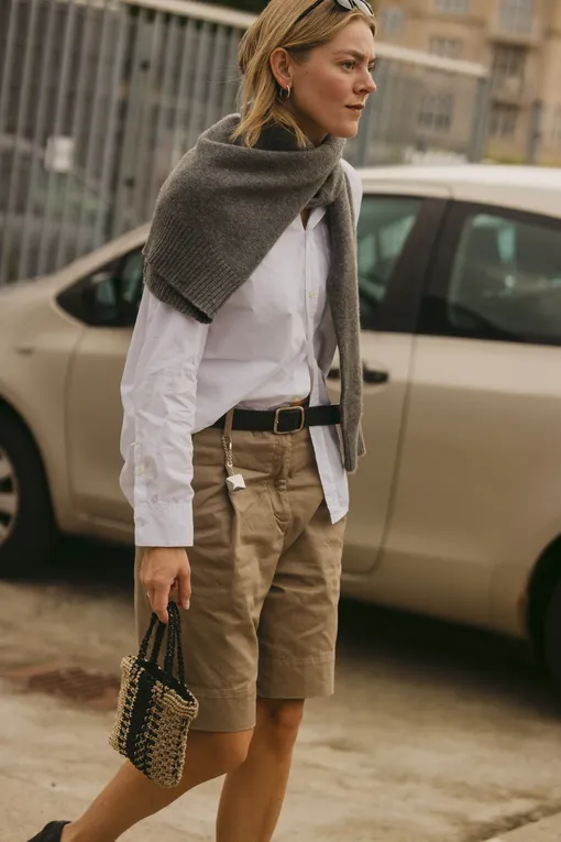 Шорты-бермуды этим летом стали настоящим фаворитом и, пожалуй, самой универсальной моделью сезона. Их можно носить с футболкой, кроп-топом или жакетом, но самый элегантный вариант — в комбинации с белой рубашкой. Чтобы образ выглядел завершенным, модницы из Копенгагена советуют добавить свитер. Накиньте его на плечи и завяжите узлом. Такой прием не только делает ансамбль более стильным, но и решает практическую задачу: в любой момент свитер можно надеть. Это универсальное решение для тех, кто хочет выглядеть современно и при этом не жертвовать комфортом.