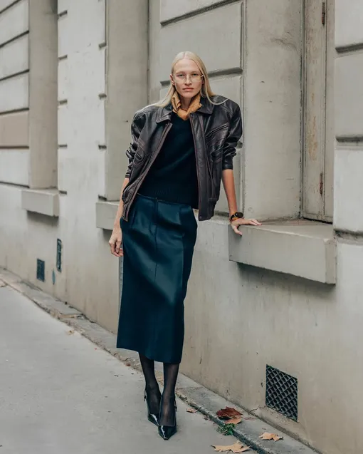 На первый взгляд сочетание кажется очевидным. Куртка плюс юбка из того же материала — ничего необычного или сложного. Но в этом и кроется сила дуэта. Такие вещи есть почти у каждой, и каждая сможет собрать тандем по-своему, не теряя индивидуальности. Начнем с куртки. Самый узнаваемый вариант — косуха. Косая молния, ремень, фиксирующий посадку, и карманы, которые добавляют функциональности. Но актуальны и другие интерпретации: модели в духе бандитской эстетики 90-х, версии с высоким горлом, куртки с акцентной линией плеча, привет из 80-х. В эту же категорию можно отнести и кожаный бомбер. Теперь юбка. Здесь также есть простор для экспериментов: классический «карандаш», опция А-силуэта, прямая модель, с драпировкой или на низкой посадке. Самая универсальная длина — миди или мидакси. Цветовая палитра пусть будет нейтральной: черный и коричневый остаются беспроигрышными вариантами. Интересный ход — соединить разные оттенки кожи. Например, шоколадный «верх» и юбку насыщенного красного тона. Контраст сделает образ выразительнее.