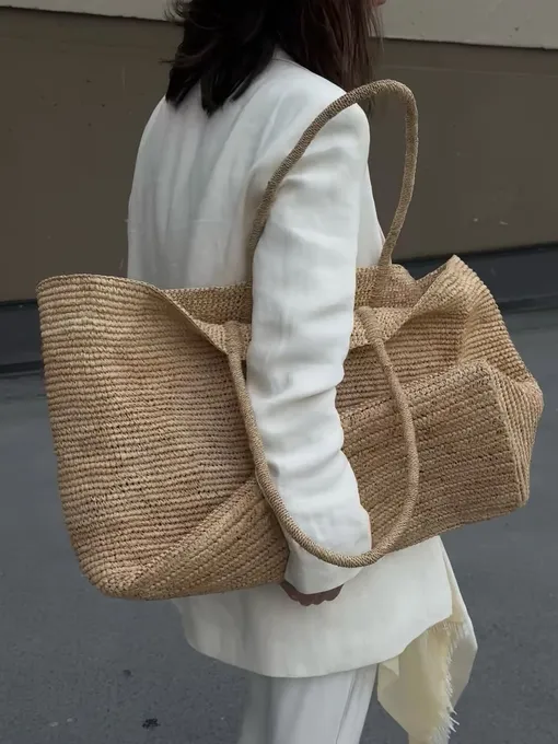 Почему вместительная большая сумка не из кожи — самый лучший вариант на летний сезон? Во-первых, потому что дизайнеры брендов продумали ее так, что у нее есть разные отделения под разные назначения. Например, потайной карман внутри для ключей и картхолдера, обвес в виде-мини кошелька для карт, разделение секций для того, чтобы бумаги и документы не путались с остальными вещами, и многое другое. Во-вторых, очень часто именно кожа (особенно если она черная!) выглядит очень массивно и разрушает визуальный ряд легкого аутфита из летящего льна, хлопка или шелка. Наконец — такая сумка легко найдет применение в любых случаях: от загруженного дня в городе до ленивого времяпровождения на пляже.