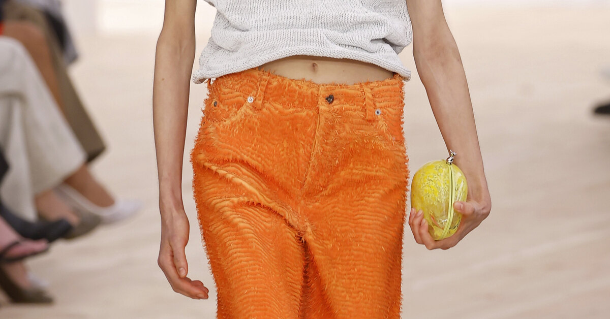 Второй прием строится вокруг одной вещи, привлекающей все внимание. Вы выбираете выразительный «низ» и поддерживаете его нейтральным «верхом». Loewe сочетает оранжевые джинсы с серой футболкой, а Tory Burch — трендовую красную кожаную юбку на низкой посадке с бежевым джемпером-поло. Такой подход особенно удобен для повседневных луков. И, естественно, вы можете менять элементы на свое усмотрение и использовать этот прием наоборот.