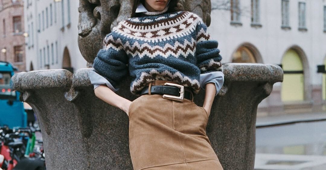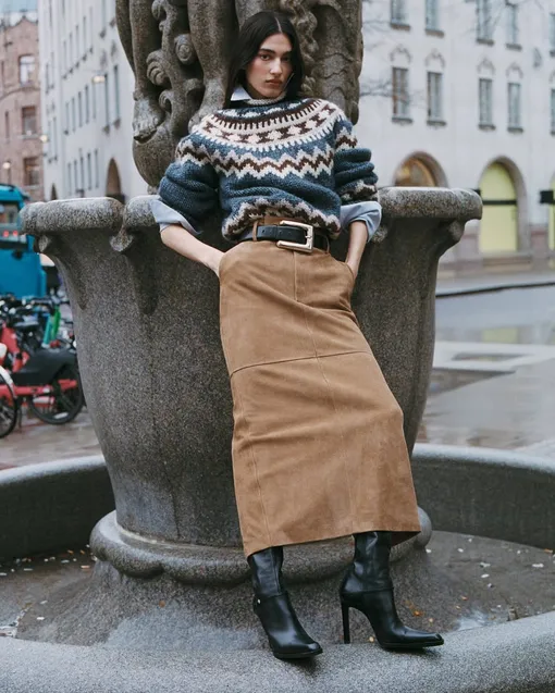 В цветах лучше придерживаться сдержанной палитры: коричневого, бежевого, черного или серого. Эти оттенки не спорят с остальными элементами лука и позволяют юбке прожить не один сезон. В стилизации замшевая юбка удивительно гибкая: она спокойно подходит под грубые ботинки и длинный пуховик, и так же убедительно смотрится с высокими сапогами и шубой. И не забудьте добавить широкий ремень. Эта версия может быть и фоном, и главным акцентом. Перед вами 5 вариантов, которые можно купить прямо сейчас.