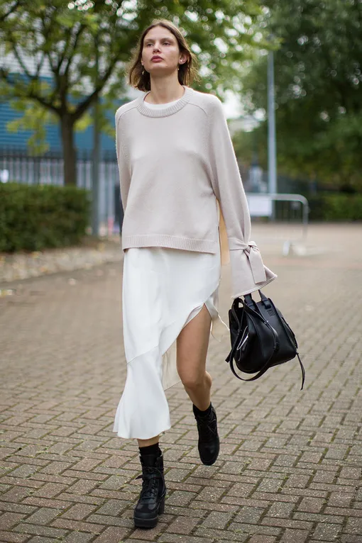 Сочетание джинсов и свитера не чуждо постоянным героям хроники стритстайла, но эти заядлые трендсеттеры всегда в поисках интересных комбинаций. Одна из таких — миди-юбка и объемный длинный свитер — проверенный временем образ, сочетающий в себе комфорт и женственность. А главное, он будто создан для российских зимних реалий. Не бойтесь смешивать цвета и фактуры — плиссированная юбка и свитер крупной вязки, шелковая струящаяся с однотонным кашемиром или карандаш с оверсайз-джемпером с горлом.
