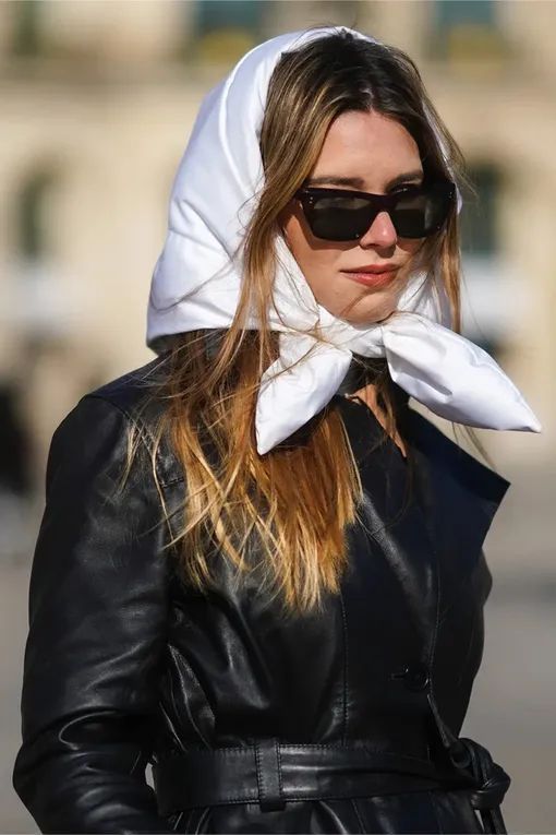 В отличие от шапки, которая всегда будет выглядеть одинаково, косынка дает большой простор для экспериментов. Ее можно просто завязать узлом под подбородком, надеть как бандану или обернуть ее концами шею и завязать сзади. Такой способ обеспечит дополнительное тепло. Косынка может быть однотонной или с лаконичным узором — главное, чтобы она хорошо подходила к уже имеющейся у вас верхней одежде и легко вписывалась в самые разные образы.
