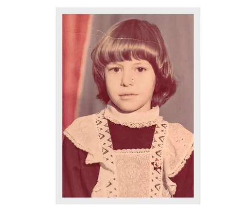 Выбрала именно это фото, потому что на нем я запечатлена 1 сентября третьего класса, в который пошла в городе Дели. После своей первой российской линейки с гладиолусами, которые были больше меня, всегда выбирала малюсенькие букеты. А прическу такую и сейчас ношу.