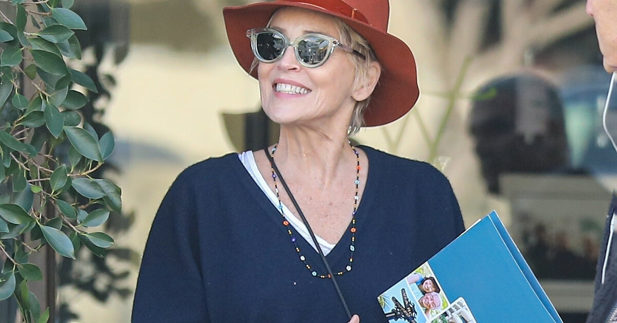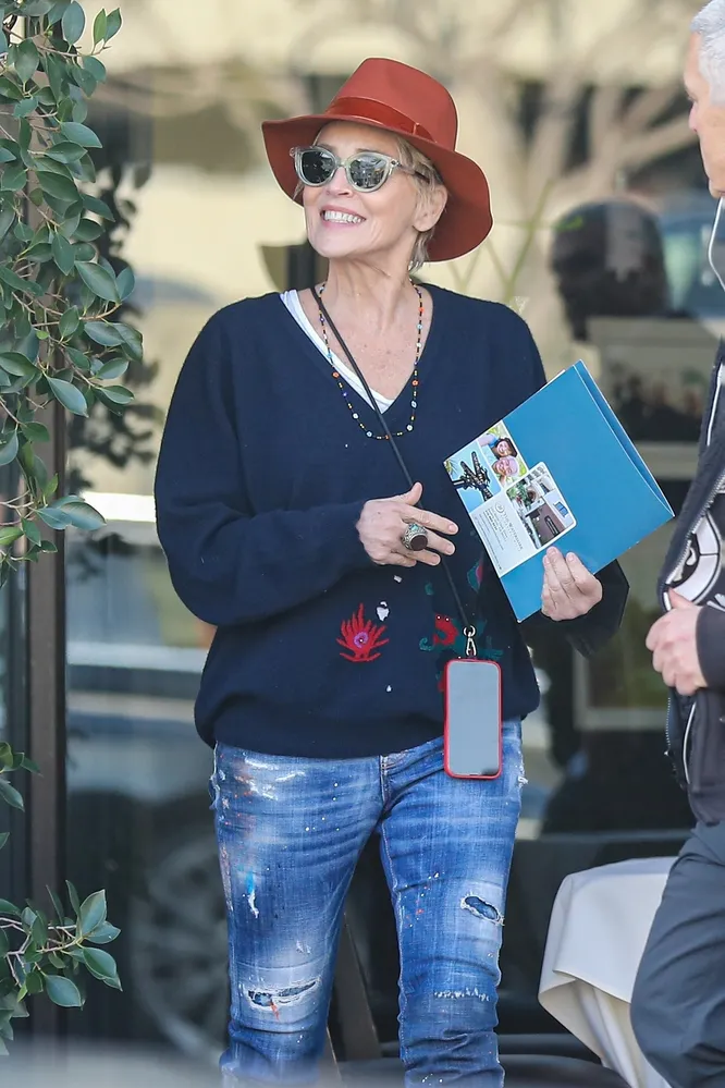 Рыжая фетровая шляпа, зеленые ботильоны и свитер с принтом: Шэрон Стоун смело сочетает яркие цвета в повседневных образах
