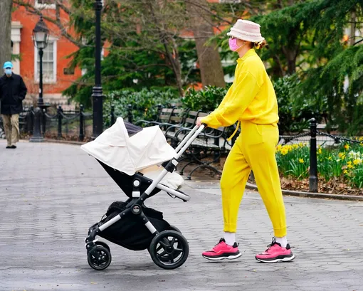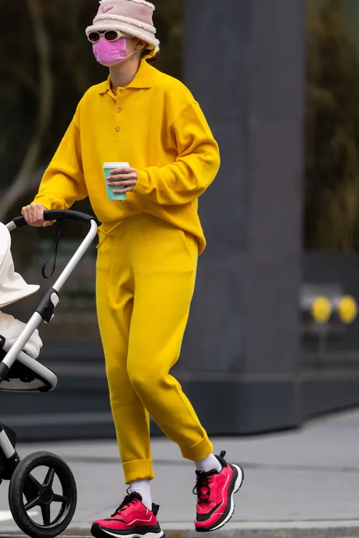 Супермодель и молодая мама для недавней прогулки с дочерью выбрала спортивный костюм в самом модном оттенке года по версии Pantone — желтом. Правда, дополнить его она решила не серым, который институт предлагает в качестве второго самого модного, а розовым — в разных тонах этого жизнерадостного цвета она выбрала обувь и аксессуары. Меховая панама Prada, яркие кроссовки и даже защитная маска для лица — все исключительно в розовом. Получилось контрастное и яркое сочетание, которое скрасит любые серые будни.