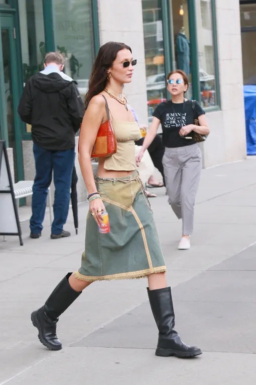 Всего в одном образе ей удалось совместить все, за что мы так любим стиль 2000-х. Джинсовую юбку с низкой посадкой в технике пэчворк она надела с коротким бежевым топом на тонких бретелях — так лет 15 назад вполне могла бы одеться Бритни Спирс или Пэрис Хилтон. К этому комбо она добавила главный аксессуар того времени: миниатюрную сумку-багет, надетую на плечо. Завершили все черные сапоги на плоском ходу — пожалуй, лучшая (и самая удобная) обувь на наступившую осень. И, конечно, не обошлось без любимых очков модели в узкой прямоугольной оправе.