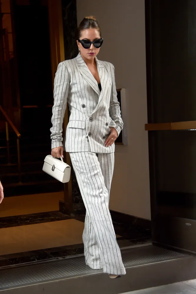 И в офис, и для стритстайла: Леди Гага в идеальном брючном костюме в полоску на все случаи жизни