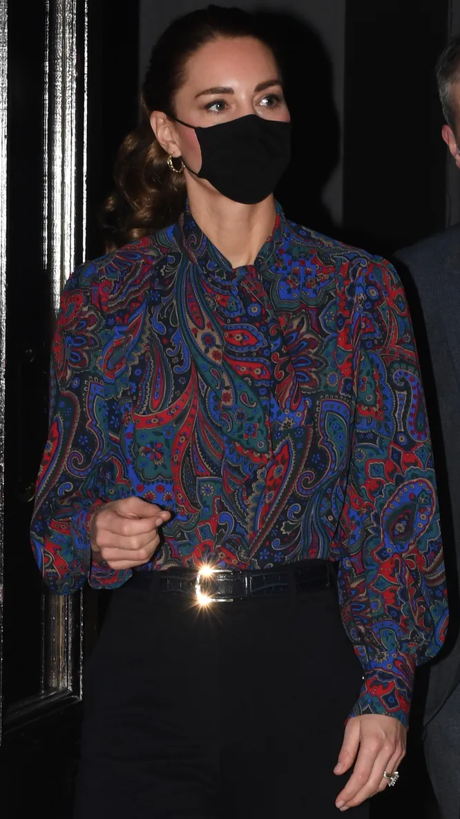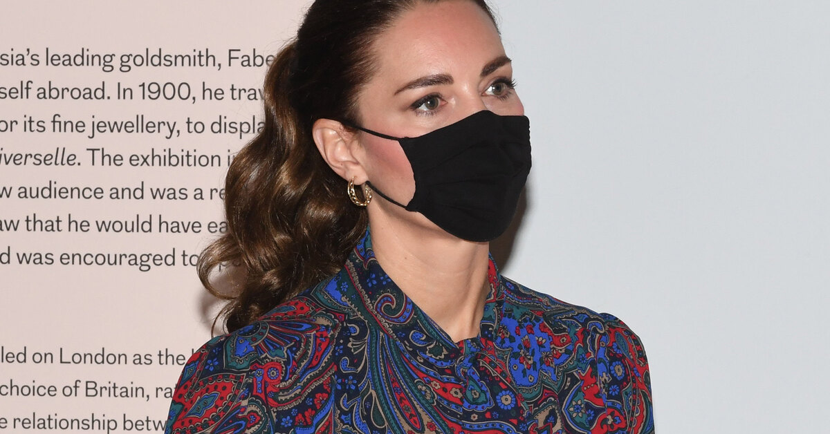 На выставку, посвященную творчеству Карла Фаберже, Кэтрин надела блузку Ralph Lauren в стиле 70-х, украшенную сине-красным узором пейсли. Чтобы «уравновесить» образ, к яркой блузке Кейт надела классические черные брюки. Из аксессуаров на герцогине были аккуратные золотые серьги-кольца и защитная маска черного цвета, а волосы она убрала в высокий гладкий хвост.