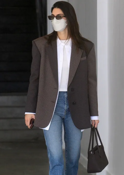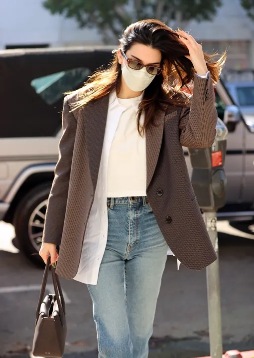 Как выглядеть стильно в белой футболке и базовых джинсах — носите их с клетчатым жакетом и сумкой в тон, как Кендалл Дженнер