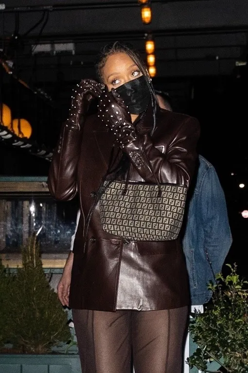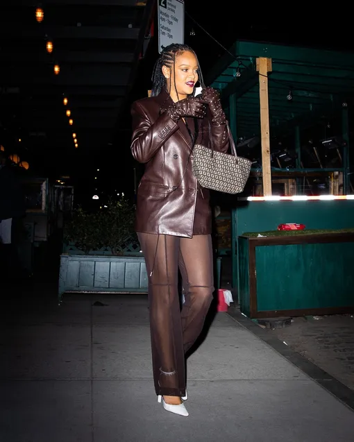 Певица и бьюти-магнат выбрала комбо кожаного жакета и абсолютно прозрачных брюк из сетки, на которое решится далеко не каждая девушка. Этот образ в красивом глубоком оттенке бургунди она дополнила перчатками с шипами в тон от Bottega Veneta, белыми остроносыми туфлями с завязками на щиколотке The Attico и небольшой сумкой с монограммами Fendi. Мало кто осмелится повторить такой модный трюк, но эти немногие однозначно соберут самые восторженные реакции — совсем как сама Рианна.