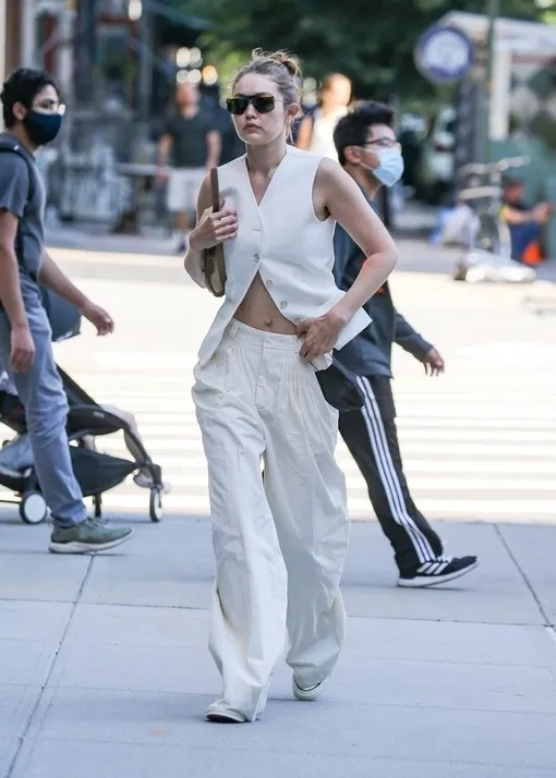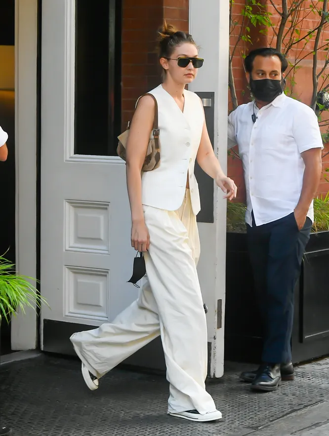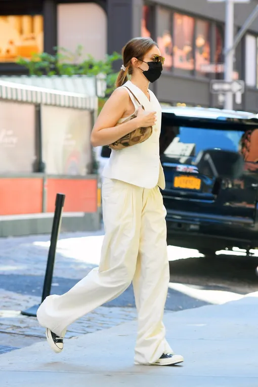 Модель и молодая мама появилась на публике в тотал-луке нежного кремового оттенка: широких брюках с защипами на талии, жилете н пуговицах и кедах. Самой интересной деталью стал жилет, ведь девушка застегнула его не на все пуговицы, а лишь на одну. Возьмите этот прием на заметку: он поможет оживить даже самый базовый и простой лук. Завершила образ сумочка-багет красивого оттенка кофе с молоком, которую Хадид надела на плечо.