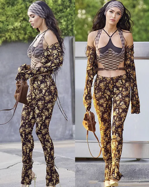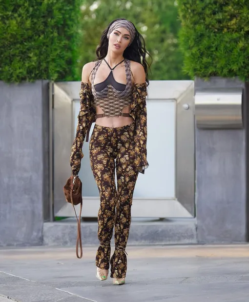 Меган Фокс, на равне с Рианной, большая поклонница эпатировать поклонников своими смелыми нарядами. Вчера папарацци поймали актрису, когда она спешила по делам в Лос-Анджелесе. На 35-летней звезде фильма «Тело Дженнифер» был комплект из весенне-летней коллекции KNWLS. Облегающие брюки с низкой посадкой и топ-корсет подчеркнули идеальную фигуру актрисы и показали ее рельефный пресс. У костюма Меган была очень интересная яркая расцветка, которую сама Фокс на своей странице в инстаграм (Социальная сеть признана экстремистской и запрещена на территории Российской Федерации) сравнила с... бабушкиным диваном.