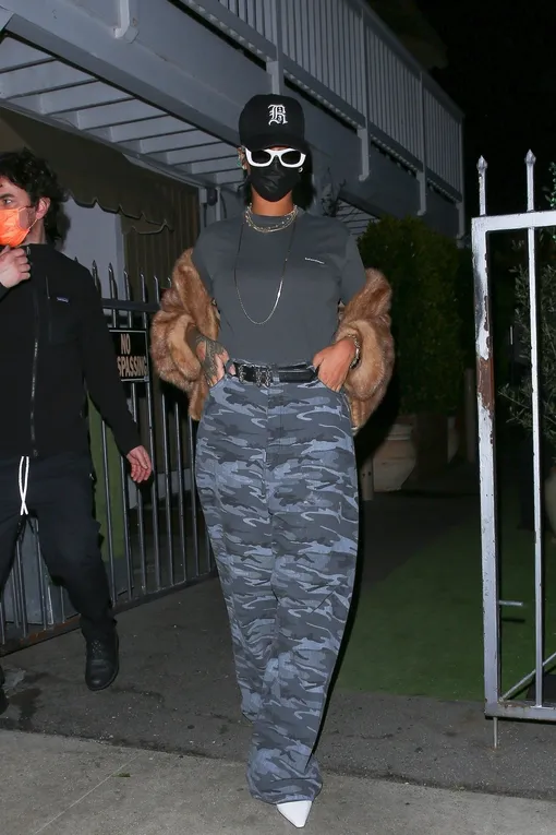 Образ певицы мог бы быть вполне стандартным повседневным нарядом: широкие камуфляжные брюки, простая серая футболка, темные очки и черная бейсболка (самый модный головной убор этой весны). Но, известная своей любовью к экстравагантным выходам, она дополнила этот ничем не примечательный комплект тремя деталями, которые моментально вывели его в статус ультрамодного. К этой комбинации она добавила несколько акцентных цепей на шее, изящные белые лодочки на шпильке и буржуазное меховое манто, как у кинодив середины прошлого века. Получился эклектичный образ, который не останется без внимания при любых обстоятельствах.