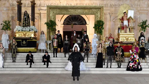 Дизайнерский дуэт решил показать новую коллекцию на родине Доменико Дольче — Сицилии, в маленькой деревне Марцамеми. О знойном итальянском юге напоминала не только локация, но и образы на подиуме: черные вуали, золотые аппликации наподобие декора барочных церквей, архитектурные рукава в виде Херувимов и множество традиционных пестрых цветовых сочетаний.