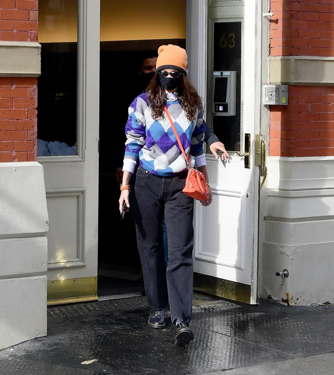 Судя по всему, именно этим принципом руководствуется Белла Хадид. Модель выбрала для недавнего выхода ярко-оранжевую шапку, которая идеально подходит по цвету под ее миниатюрную сумку — безупречное комбо. Еще одна яркая деталь — джемпер в ромб в стиле преппи с орнаментами синего и фиолетового цветов, который создает правильный контраст аксессуарам. Чтобы не усложнять и не перегружать лук, завершить его она решила модными в этом сезоне прямыми темно-серыми джинсами и простыми черными ботинками на толстой подошве. Вы тоже можете одеться подобным образом, даже несмотря на морозы за окном — просто добавьте к луку еще и яркий пуховик.