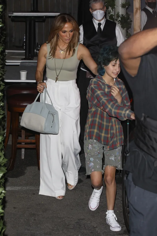 Для этого она выбрала облегающий серо-бежевый топ на тонких бретелях, широкие белые брюки с высокой посадкой и защипами, босоножки на высоких каблуках, серо-голубую сумку, но самое главное — это украшения. Это подарок от возлюбленного: она надела набор тех самых колье, которые Бен Аффлек подарил ей на ее 52-й день рождения в знак любви. В них зашифровано тайное послание: по словам дизайнера, который работал над подарком, он рассказывает историю любви между актером и певицей. Советуем особенно присмотреться к широким белым брюкам певицы: это одна из главных вещей этого лета. Успейте «выгулять» ее, пока оно не закончилось.