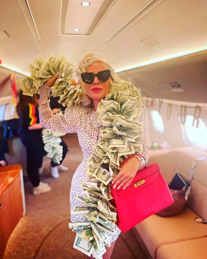 Хэнд-мейд аксессуары имеют все шансы стать новым трендом — но лишь в том случае, если это боа, как у Леди Гаги. Певица поделилась в своем Instagram (Социальная сеть признана экстремистской и запрещена на территории Российской Федерации) новым эксцентричным образом. На фото она позирует в интерьере частного самолета в платье в мелких горох, с ярко-розовой сумкой Hermès Kelly и в черных очках в крупной оправе. Однако взгляд привлекает ее самодельное боа, составленное из десятков купюр номиналом $100.