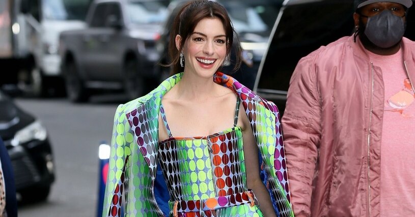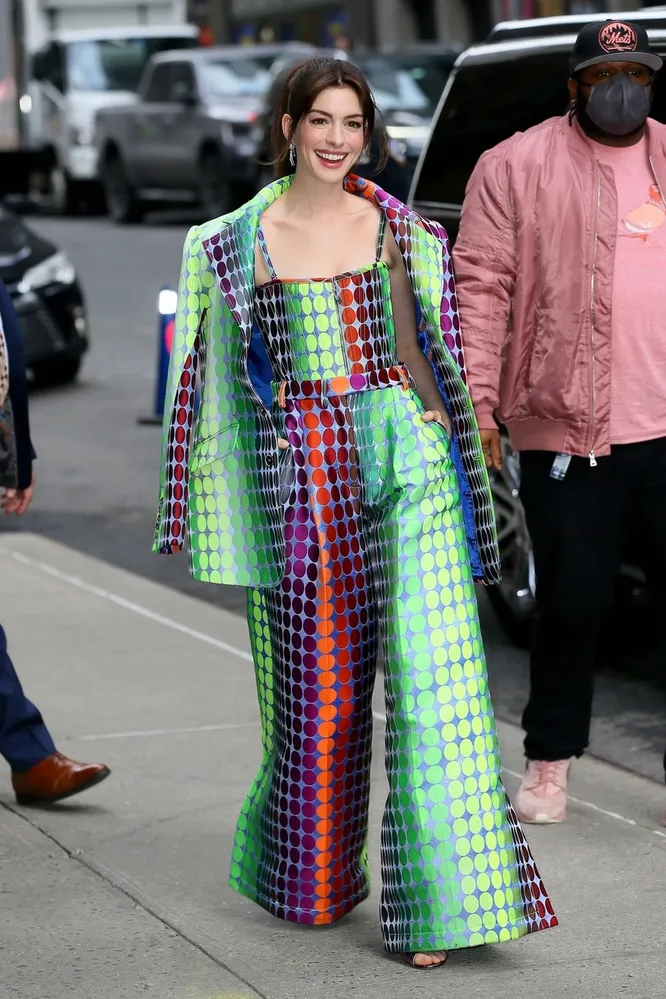 Вчера оскароносная звезда отправилась на съемки The Late Show With Stephen Colbert, и папарацци удалось поймать ее возле Нью-Йоркской телестудии. В эфире Энн появилась в очень ярком наряде Christopher John Rogers. Комплект из топа и брюк-палаццо на высокой посадке был украшен принтом, состоящим из множества разноцветных кругов. Поверх топа актриса накинула объемный пиджак с широкими плечами с таким же узором. Завершили образ аккуратные босоножки на шпильке и ярко-голубая сумка Versace.