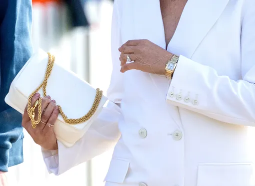 Вчера в Гааге состоялся приветственный прием мероприятия, курируемого принцем Гарри. Для первого за последний год королевского тура Меган выбрала безупречностей образе от Valentino с удлиненным двубортным жакетом и широкими брюками. Белоснежный цвет костюма особенно эффектно смотрелся на фоне загорелого оттенка кожи герцогини. Свой бесподобный образ Меган дополнила грамотно подобранными аксессуарами, в том числе кремовой сумкой итальянского модного Дома и лодочками Aquazurra в тон всему наряду. В качестве завершающих штрихов она использовала изящные золотые часы Cartier, когда-то принадлежавшие принцессе Диане, лаконичный кулон и необычное кольцо с цепочкой, переходящей в браслет.