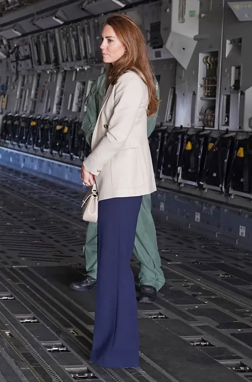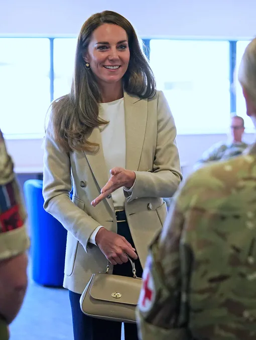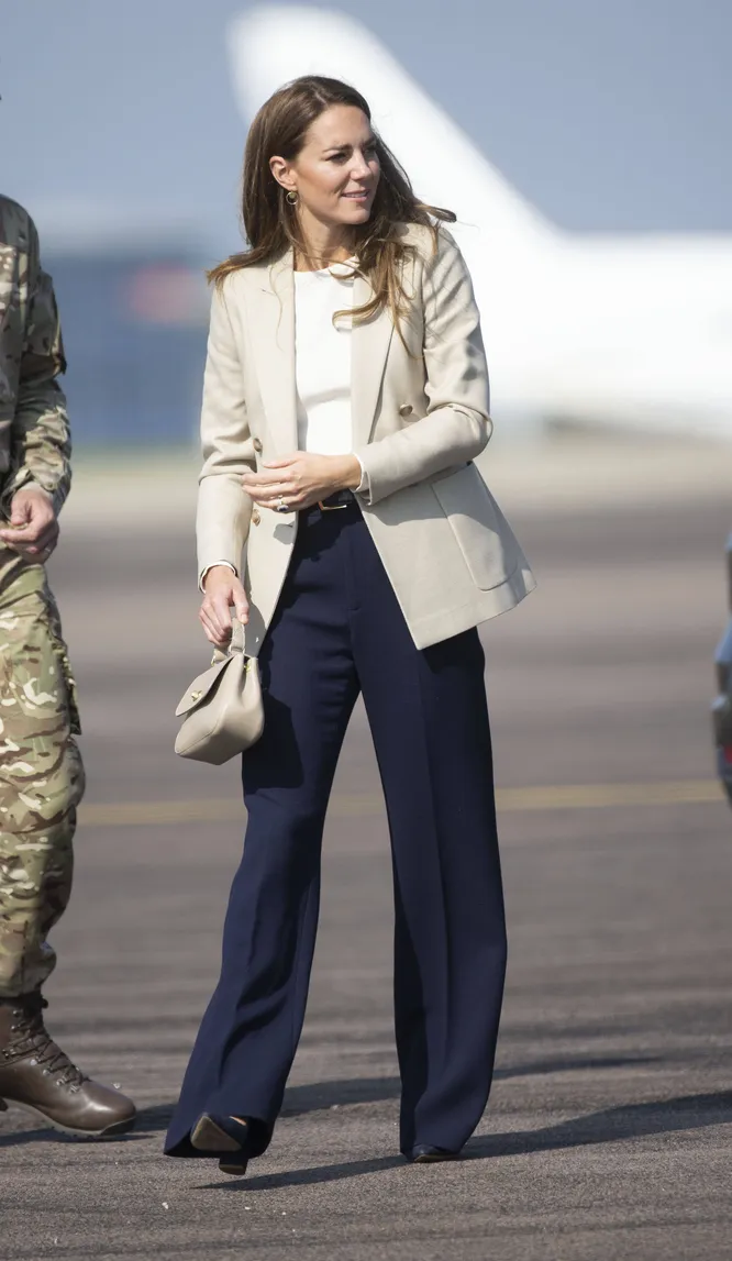 Образ на все случаи жизни: Кейт Миддлтон в бежевом жакете и темно-синих брюках встретилась с британскими военными