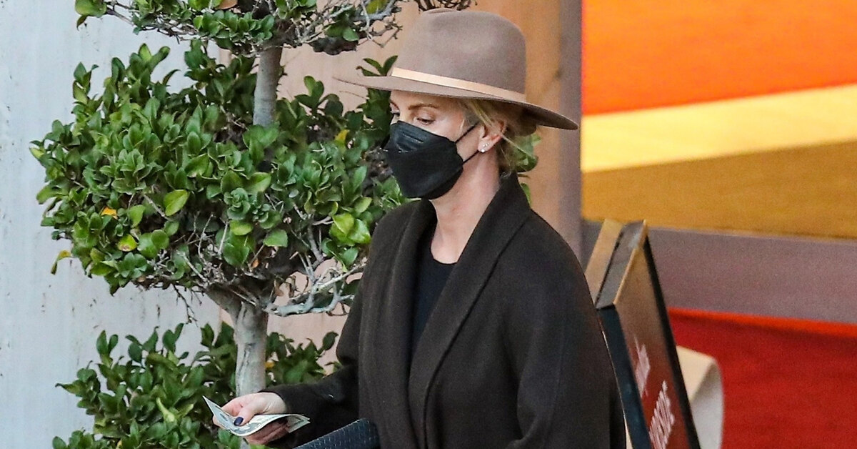 Даже для простого похода за покупками Щарлиз выбрала очень стильный, хоть и простой образ. Оскароносная актриса надела классические синие джинсы и черный свитер, а в качестве верхней одежды выбрала длинное черное оверсайз пальто-халат с поясом и накладными карманами. Дополнили наряд актрисы высокие кожаные сапоги на высоком каблуке и бежевая фетровая шляпа с широкими полями. Вместо сумки у Шарлиз был только небольшой кожаный кошелек, а лицо все время закрывала тканевая защитная маска.
