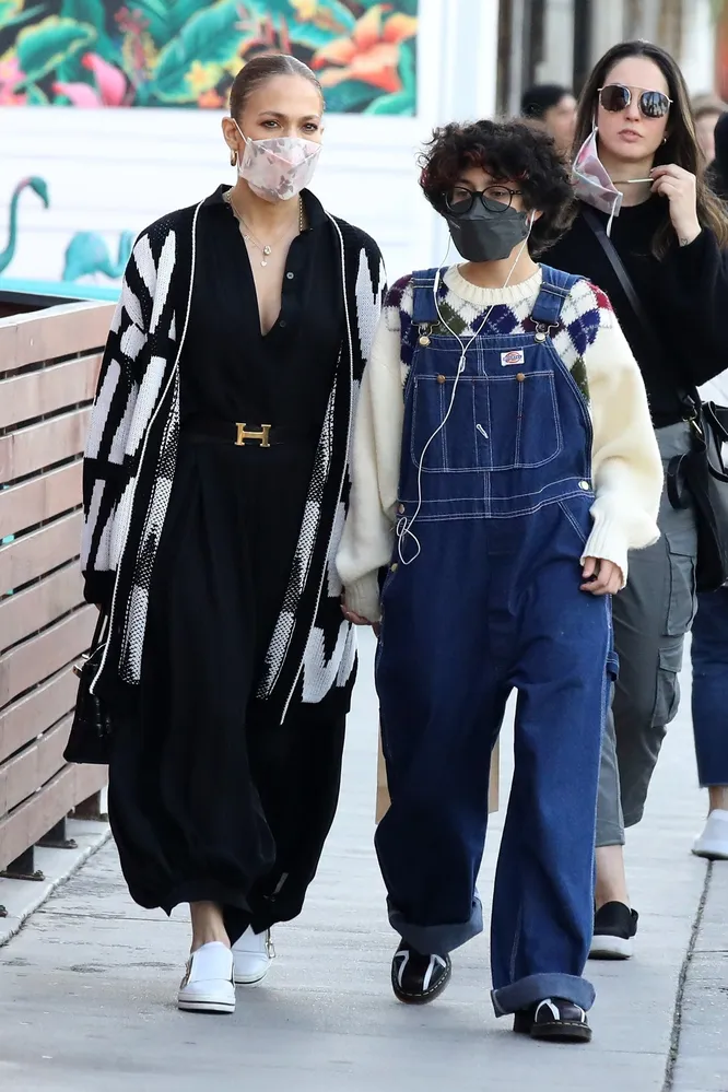 Для семейного уик-енда 52-летняя звезда выбрала очень расслабленный образ. Дженнифер надела свободный черный комбинезон с широкими штанами и удлиненный черно-белый кардиган. Актриса подчеркнула талию черным ремнем Hermès с массивной пряжкой, а все необходимые вещи уместила в миниатюрную черную сумку из крокодиловой кожи. Привычные ботильоны на высоком каблуке Джей Ло сменила на белые кожаные слиперы, украшенные золотыми цепочками. Все время, пока звезда находилась на улице, она не снимала нежно-розовую защитную маску, украшенную цветочным узором.