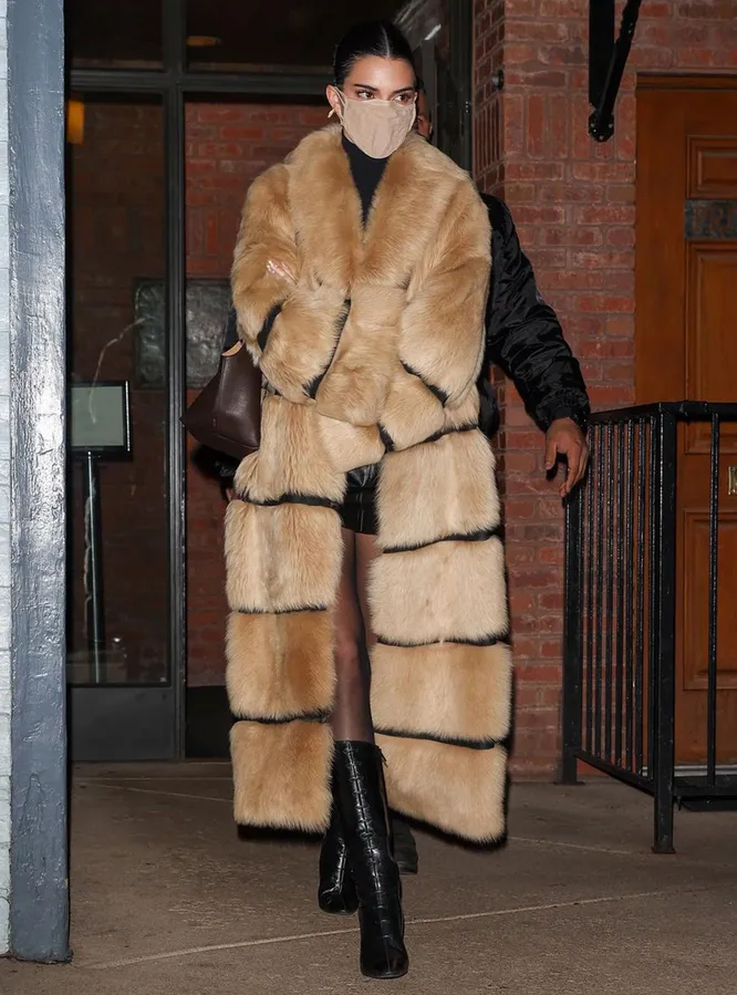 Вчера папарацци поймали телезвезду, когда она на ужин с несколькими близкими друзьями после насыщенного дня, проведенного на горнолыжном склоне. Из всех способов утеплиться Кендалл, пожалуй, выбрала самый женственный — длинную пушистую шубу из искусственного меха бежевого цвета. Из под верхней одежды модели виднелась черная водолазка и кожаная мини-юбка молодого молдавского бренда Fidan Novruzova. Свои бесконечно длинные ноги Дженнер подчеркнула при помощи тонких черных колготок и высоких сапог на каблуке. Все необходимые вещи звезда поместила в коричневую кожаную сумку, которую несла на плече, а на лице у нее было сразу две защитных маски. Одна из них — от бренда Skims, который принадлежит старшей сестре Кендалл — Ким Кардашьян.