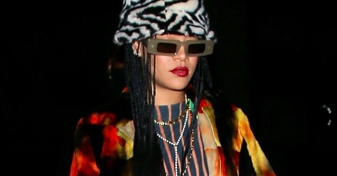 Сделали образ таким стильным и необычным, конечно, еще и аксессуары. В качестве головного убора Рианна выбрала меховую шляпу с принтом «под зебру», который дополнил рисунки на одежде. На ноги певица надела белые туфли на шпильке с острым носом, который выглядывал из-под длинных брюк. Завершили аутфит узкие прямоугольные очки и ожерелья из бусин, надетые в несколько рядов.