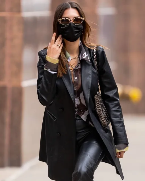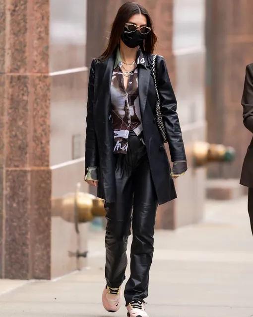 Ратаковски — самый наглядный пример того, как балансировать на грани и собирать одновременно яркие и уместные в повседневной жизни образы. Для своего недавнего выхода модель выбрала total look из кожи — черный кожаный плащ она дополнила брюками из того же материала. Получилось крайне эффектно. Но главное — вполне пригодно для повседневной носки. Все потому что она немного убавила градус образа с помощью простых розовых кроссовок Nike — так все смотрится гораздо более расслабленно, чем со шпильками. А рубашка с принтом, надетая навыпуск, завершает образ и делает его более продуманным.