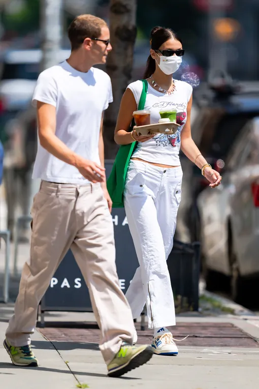 Облегающую укороченную футболку с принтом, изображающим ретро-тату с золотым карпом, модель дополнила прямыми белыми брюками с заниженной талией (тоже весьма в духе нулевых). Сзади на них красовалась надпись Punk Queen — в такой вещи в 2001 году можно было увидеть принцессу поп-панка Аврил Лавин. Завершили образ ярко-зеленая сумка-шоппер, ретро-кроссовки и трендовое «детское» колье из бисера. Судя по всему, мода на нулевые с нами еще надолго — так что, быть может, вам стоит отыскать футболку, как у Беллы, уже сейчас, пока спрос на них не взлетел до небес.