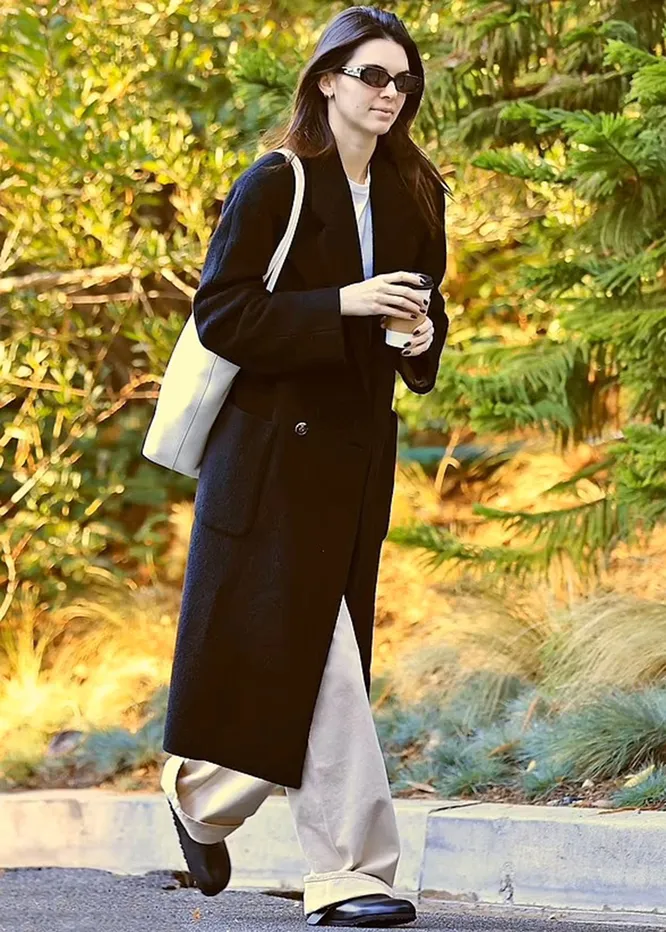 Образ модель составляла, руководствуясь принципами минимализма. Звезда надела простую белую футболку и расклешенные бежевые брюки, которые она подвернула снизу. В качестве верхней одежды Кендалл выбрала свое любимое длинное черное пальто свободного кроя, в котором ее часто можно увидеть на улицах Лос-Анджелеса. Образ дополнили черные ботинки и очень вместительная сумка-тоут из белой кожи. Чтобы защититься от солнца, модель надела темные очки.
