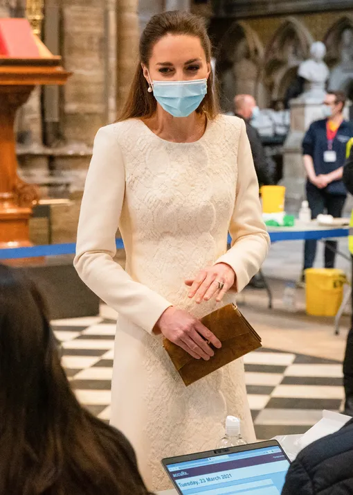 Недавно она с принцем Уильямом посетила пункт вакцинации от коронавируса, развернутый в здании Вестминстерского аббатства. Для этого выхода она выбрала элегантное кремовое пальто приталенного кроя Catherine Walker. Герцогиня Кембриджская часто носит одни и те же вещи несколько раз, но это, судя по всему, новое пополнение в ее гардеробе. Во всяком случае, ранее она не была замечена в нем. Образ она дополнила коричневыми лодочками, миниатюрной замшевой сумкой в тон и своими любимыми жемчужными сережками .