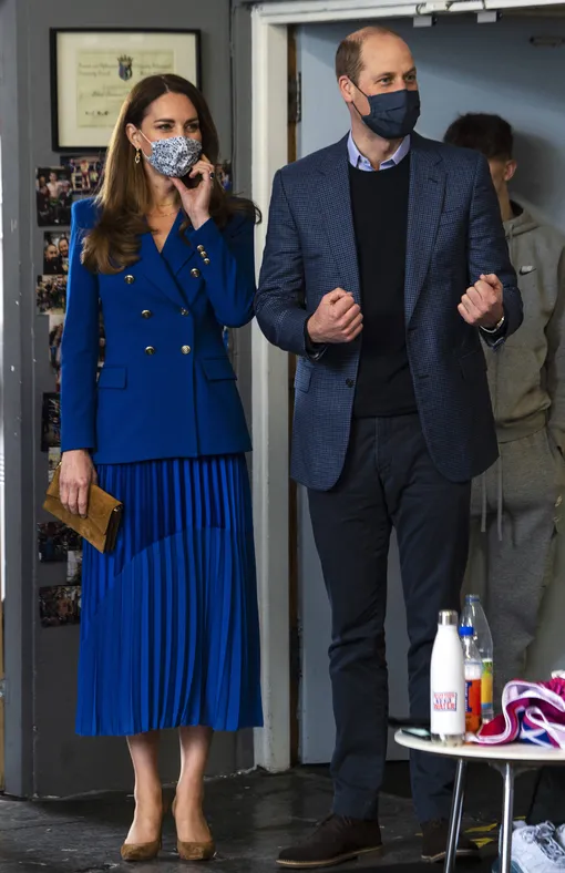 Герцогиня Кембриджская выбрала комбо из двубортного жакета Zara (здесь она осталась верна своей любви к демократичным брендам) и летящей плиссированной юбки-миди. Строгий крой и длина были продиктованы протоколом, а вот насыщенный небесно-голубой оттенок был очень символичным. Дело в том, что этот оттенок — цвет флага Шотландии. Таким символичным выбором герцогиня пытается показать свою расположенность к народу Шотландии, который время от времени хочет отделиться от Великобритании. К тому же она дополнила образ изящными сережками шотландского бренда Hamilton & Inches, который уже более 120 лет носит гордое звание официального поставщика королевского двора. Завершающими деталями образа стали светло-коричневые лодочки и замшевый клатч в тон, которые мы уже не раз видели на Миддлтон.