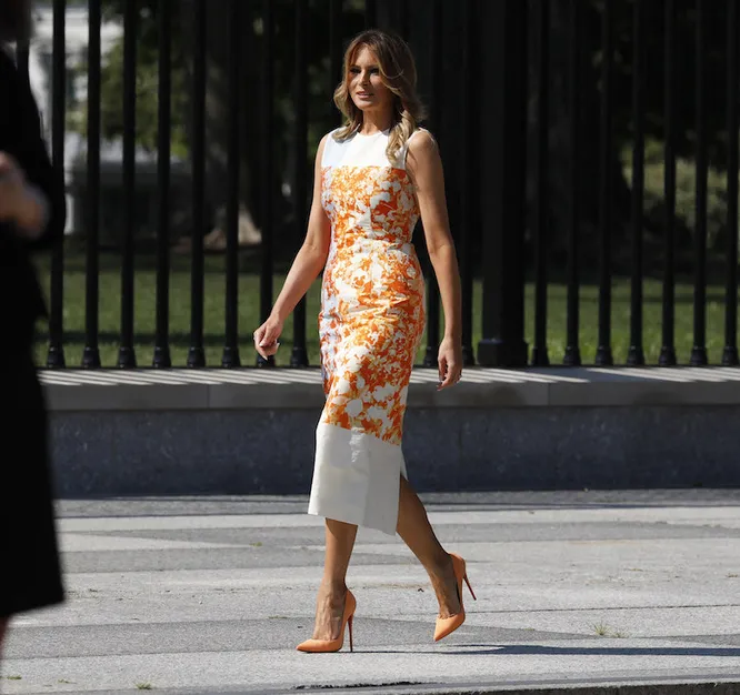 Мелания показала свой аутфит — с яркими акцентами в виде принтов и обуви, которые добавили образу свежести. На первой леди было платье от Dries Van Noten по щиколотку со сдержанным разрезом на подоле сзади. Особая его деталь — ярко-оранжевый абстрактный принт из цветов, напоминающий хаотичные разливы краски, почти как в технике тай-дай. Также Мелания Трамп дополнила платье оранжевыми лодочками на каблуке в тон принту — получился яркий, но сдержанный деловой образ.