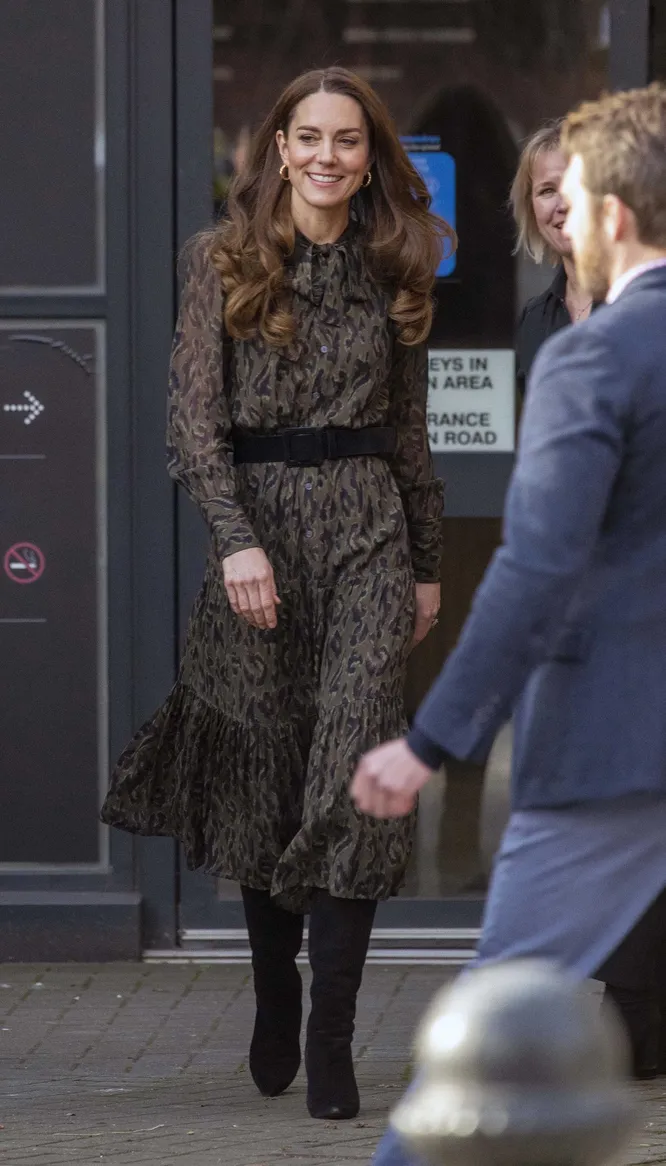 Для важной встречи герцогиня Кэтрин выбрала свое самое любимое комбо — платье длины миди и высокие сапоги. Летящее платье цвета хаки с анималистичным принтом от бренда Derek Lam 10 Crosby она сочетала с черными остроносыми сапогами Ralph Lauren из замши. Тонкую талию 40-летняя герцогиня подчеркнула при помощи черного замшевого ремня французского бренда Ba&sh, а бриллиантам из королевской сокровищницы предпочла серьги-кольца Asos. Это уже не первый раз, когда Кейт выбирает недорогую бижутерию для официальных выходов: на прошлой неделе она была замечена в серьгах Accessorize за 700 рублей.