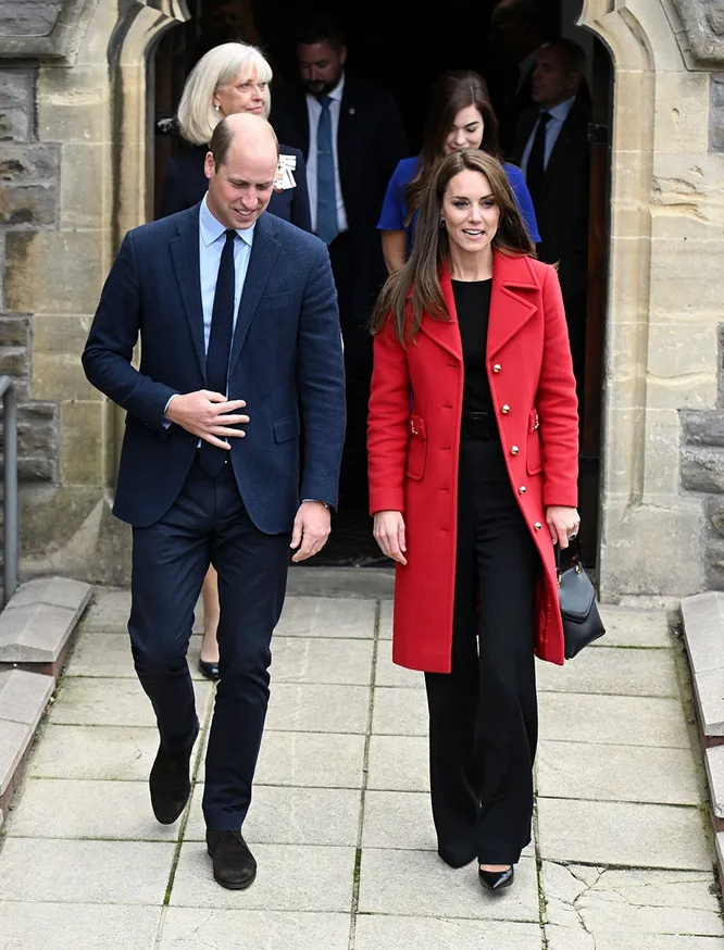 Кейт выбрала для мероприятий строгое сочетание черного и красного, не изменив любимому приталенному фасону пальто. Поклонники тут же отметили, что принцесса процитировала образ леди Ди из 1980-х. Только став принцессой Уэльской, она приехала сюда в костюме с черной юбкой плиссе и алым жакетом. Так как на флаге и гербе Уэльса изображен красный дракон, можно предположить, что обе принцессы хотели выразить своими образами уважение к истории одной из самых красивых частей Великобритании.