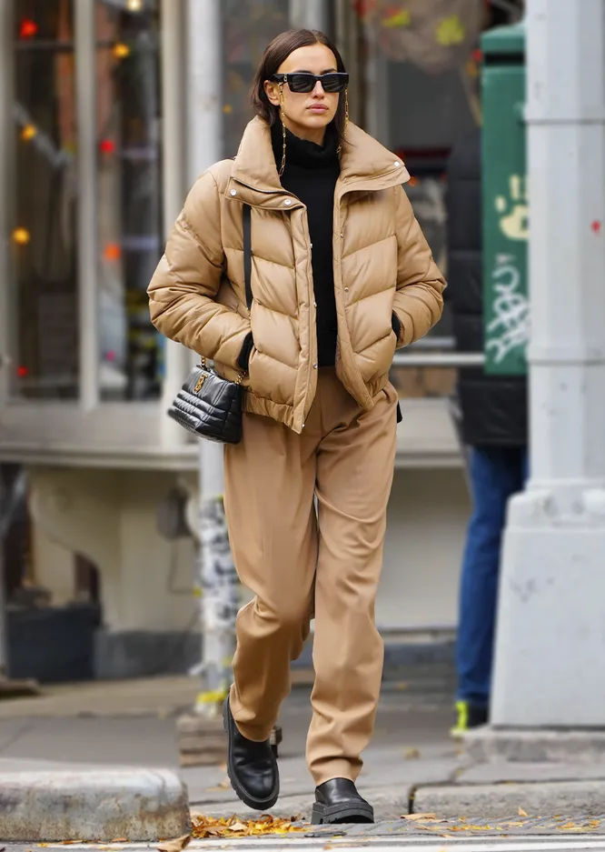 На смену классическому пальто: этой зимой носите бежевый пуховик в тон брюкам, как Ирина Шейк