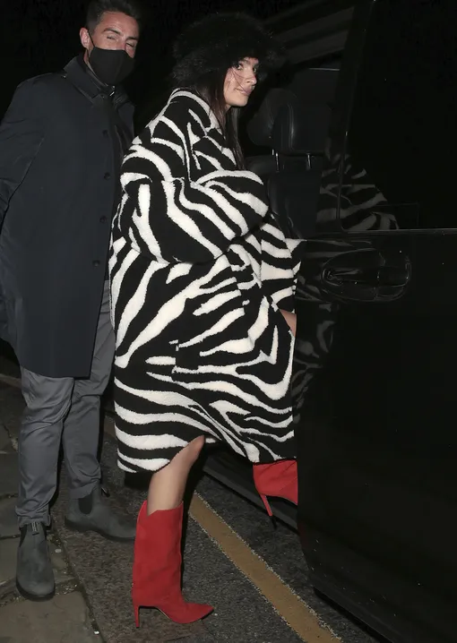 Плюшевое пальто с принтом зебры, яркие сапоги и меховая панама — все главные тренды сезона в одном образе Эмили Ратаковски
