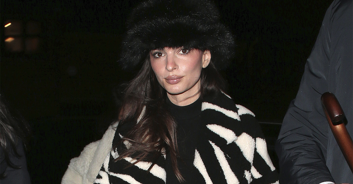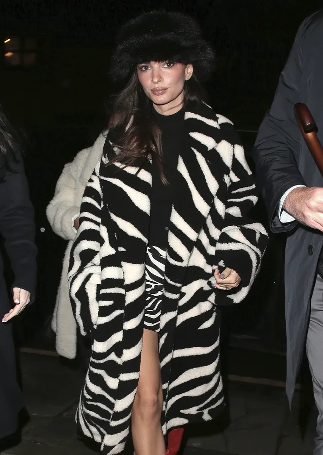 Плюшевое пальто с принтом зебры, яркие сапоги и меховая панама — все главные тренды сезона в одном образе Эмили Ратаковски