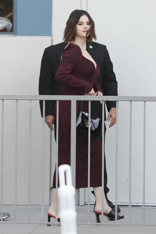 В четверг 29-летняя звезда была замечена после очередного промо-интервью в Лос-Анджелесе, на которое она надела элегантное трикотажное платье цвета бургунди с запахом и глубоким вырезом, подчеркивающим заметно округлившиеся формы актрисы и певицы. Свой образ Селена завершила черными мюлями с открытым носом и контрастной красной стелькой. Безупречное комбо для теплой осени!