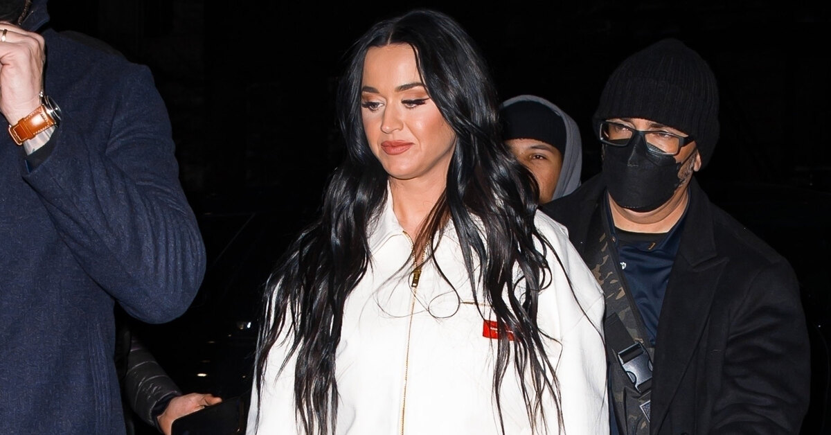 Студию Кэти покидала в канадском смокинге Alexander Wang из белого денима. Необычный крой жакета с широкими плечами подчеркнул тонкую талию звезды, классические прямые брюки — визуально сделали ноги длиннее. Свой образ Кэти дополнила белыми остроносыми лодочками на высокой шпильке. Единственным цветным элементом в образе стала небольшая красная нашивка с логотипом бренда на жакете. В макияже певица предпочла сделать акцент на глаза с помощью длинных графичных стрелок.