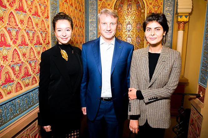 Ирина Кудрина, Герман Греф и Надежда Оболенцева на лекции Интеллектуального клуба «418»