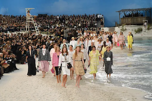 Традиционно в последний день Недели моды в Париже новую коллекцию показал Карл Лагерфельд. С его легкой руки Гран-пале уже превращался в космодром, супермаркет, греческие развалины, бульвар, тропики. Сегодня кутюрье пригласил гостей на настоящий пляж. Модели дефилировали вдоль песочного побережья, под ногами плескалась вода, вдалеке виднелись горы, а Лагерфельд приветствовал всех с деревянного мостика. На импровизированный пляж Chanel пожаловали музы модного Дома: Каролин де Мегрэ, Инес де ля Фрессанж, а также Миша Гот и (неожиданно) Памела Андерсон.